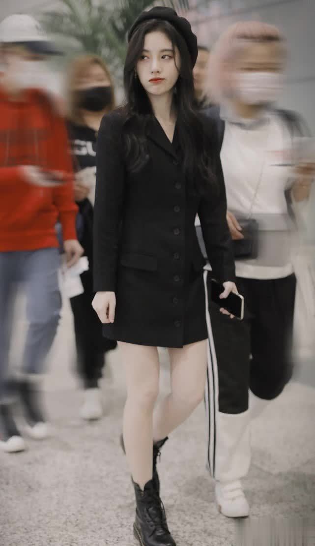 大家都知道黑色的衣服比较百搭,也不怎么挑人,适合不同年龄段、不同肤色的人穿。鞠婧祎这款西装裙是修身的版型,起到了收腰的效果,展现出纤细的小蛮腰,身材也很苗条,让人眼前一亮。