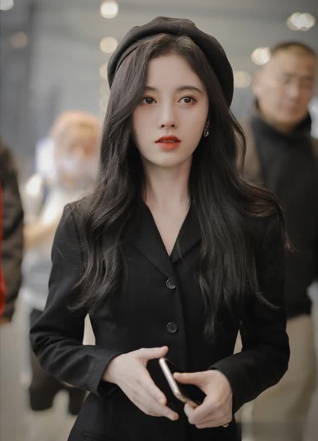 她戴着一顶黑色的贝雷帽,搭配精致的妆容,有一种御姐范儿,帅气又潮流,很适合她的气质。穿着一条黑色的西装连衣裙,属于V领口的设计,展现出白皙的肌肤,看着也很简约大方。