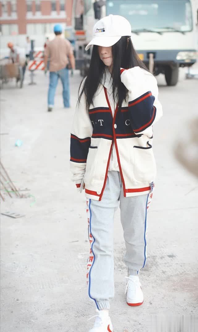 看了鞠婧祎的黑色造型,我们再来看看她的其他私服吧!这一身穿搭就很随性休闲了,一件拼色的宽松外套+浅灰色运动裤,很简约舒适的打扮,穿着也很低调,适合在春秋季节穿。